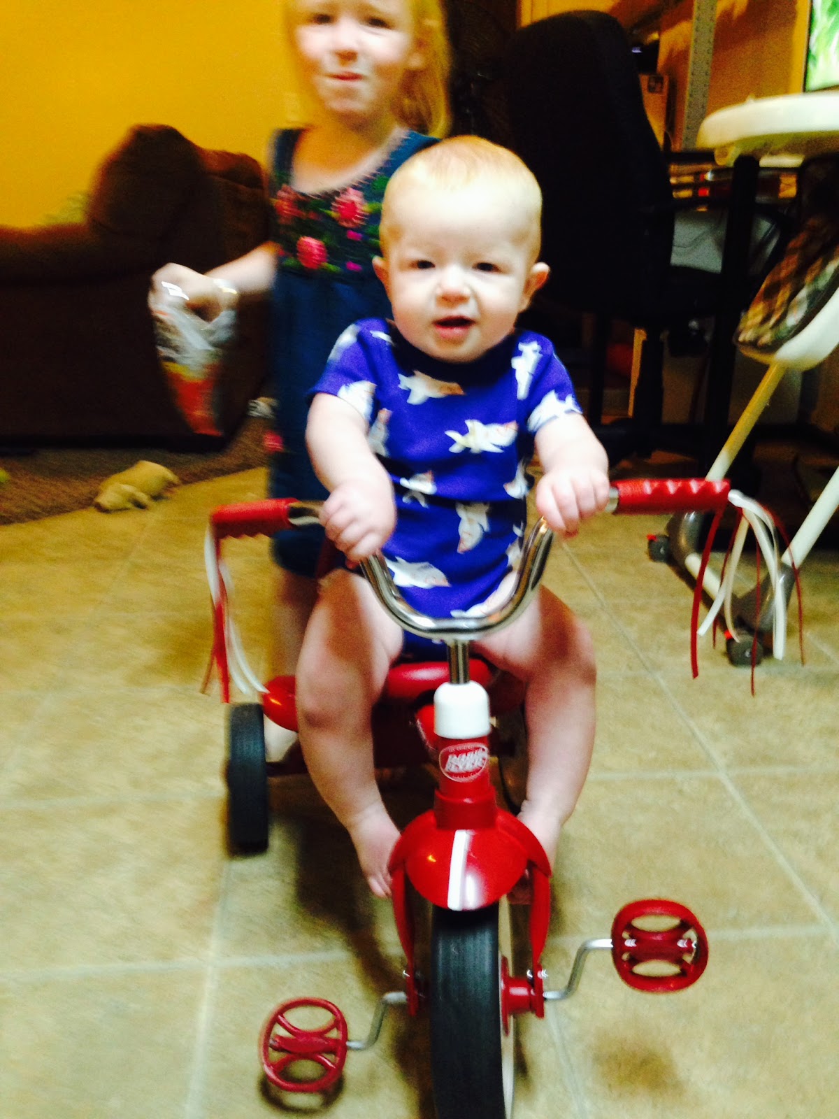 Tuesday morning was still kinda stormy in the morning but not too bad. Hayden had fun getting rides on Kylie's bike. He loves trying to do things that he is too little for still.