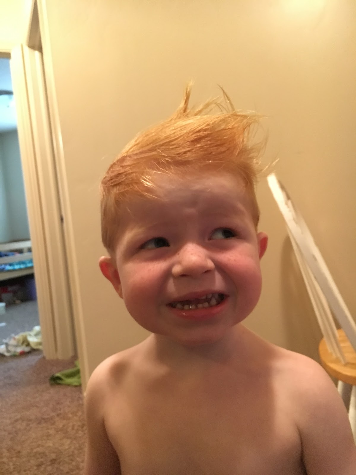 This weekend I figured it was finally time to give Hayden a haircut. He looked really cute with his long hair, but the poor kid would sweat like crazy every time we went outside. His new haircut looks great on him, though he did keep moving, so behind his ears is kinda bad!